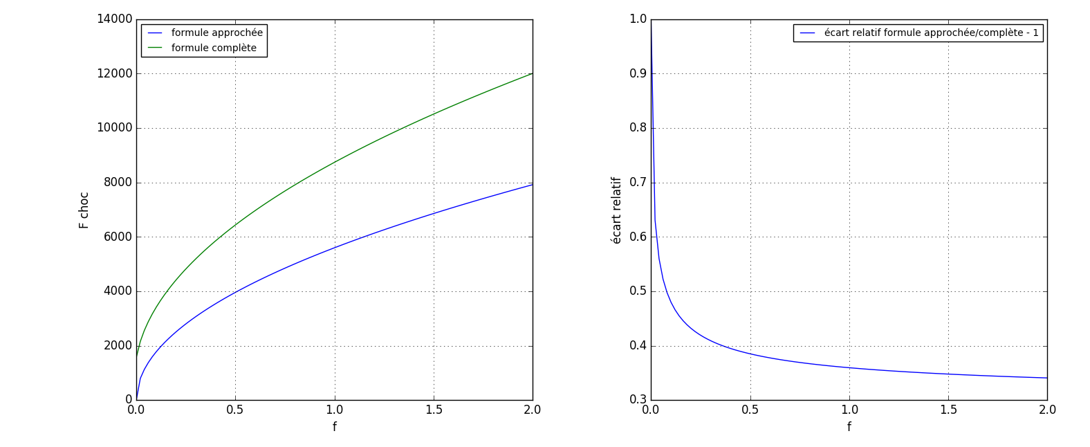 - La formule approchée \(F \simeq \sqrt{2mg\alpha\,f}\) est valable pour \(\Delta l \ll h\). En comparant les deux formules on voit qu'elle donne un résultat correct à 50% près. La valeur obtenue est inférieure à celle de la formule exacte. Voir ci-dessous une comparaison pour \(m=80kg\) et \(\alpha=4\times10^4\mathrm{N}\)