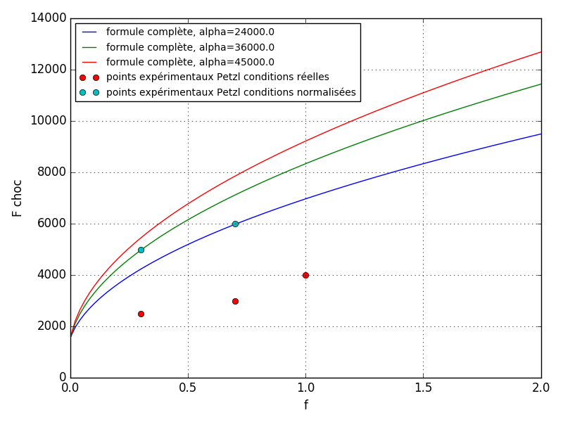 - A propos de la valeur de \(\alpha\) : on trouve \(4.5\times10^4\mathrm{N}\) avec la formule non approchée pour \(F=12kN\), \(m=80kg\), \(f=1.8\), c'est-à-dire pour la valeur limite imposée par les normes. \(\alpha\) est en réalité probablement inférieur. Par exemple si on veut coller avec les points expérimentaux mesurés par Petzl (\(F=6kN\), \(m=80kg\), \(f=0.7\)) il faut prendre \(2.4\times10^4\mathrm{N}\). La valeur réelle est probablement entre les deux.